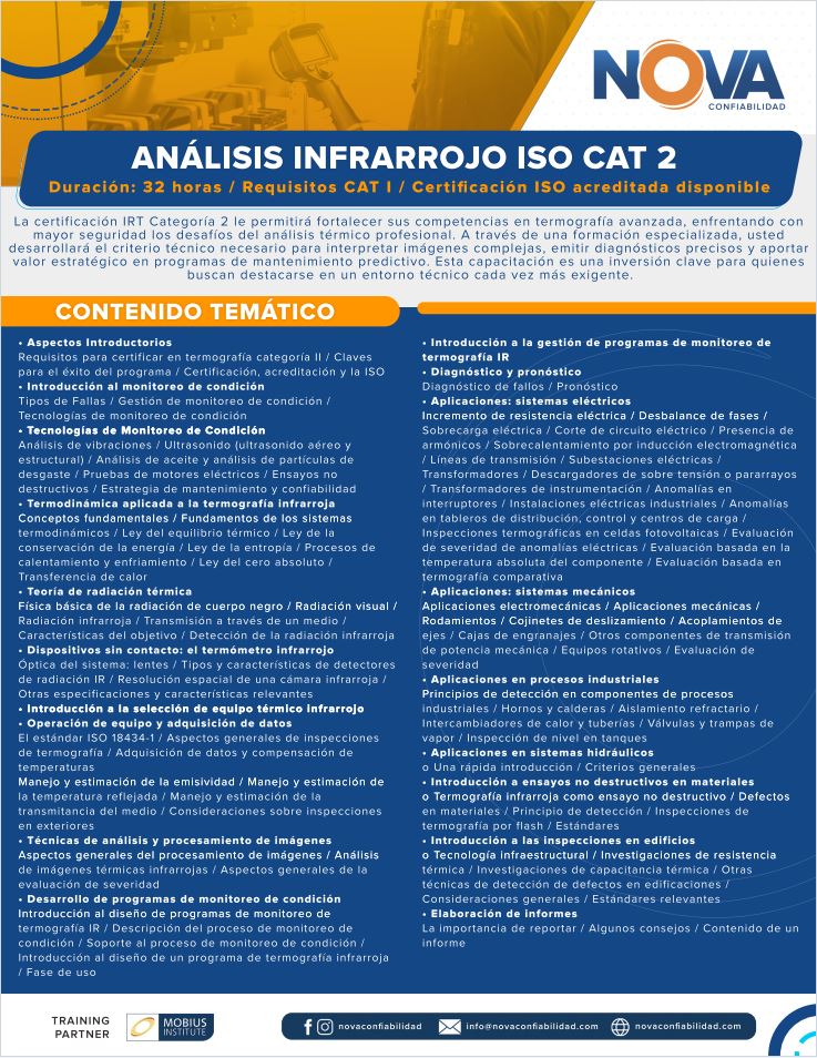 Este curso, bajo licencia Mobius Institute, transfiere todo el conocimiento necesario para desempeñarse como experto de diagnóstico mediante la tecnología de termografía infrarroja, en un amplio rango de aplicaciones, tales como: sistemas eléctricos de alta, media y baja tensión, componentes mecánicos, máquinas rotativas, intercambiadores de calor, sistemas de aislamiento, sistemas hidráulicos, válvulas, trampas de vapor, calderas, hornos, y mucho más. Un experto termógrafo debe no solamente dominar con maestría el uso de su equipo termográfico, pero además conocer con amplitud las diferentes tecnologías disponibles en el mercado, y los criterios más relevantes para el diagnóstico de problemas y su evaluación de severidad, de acuerdo con las normas ISO 18436 e ISO 17024.